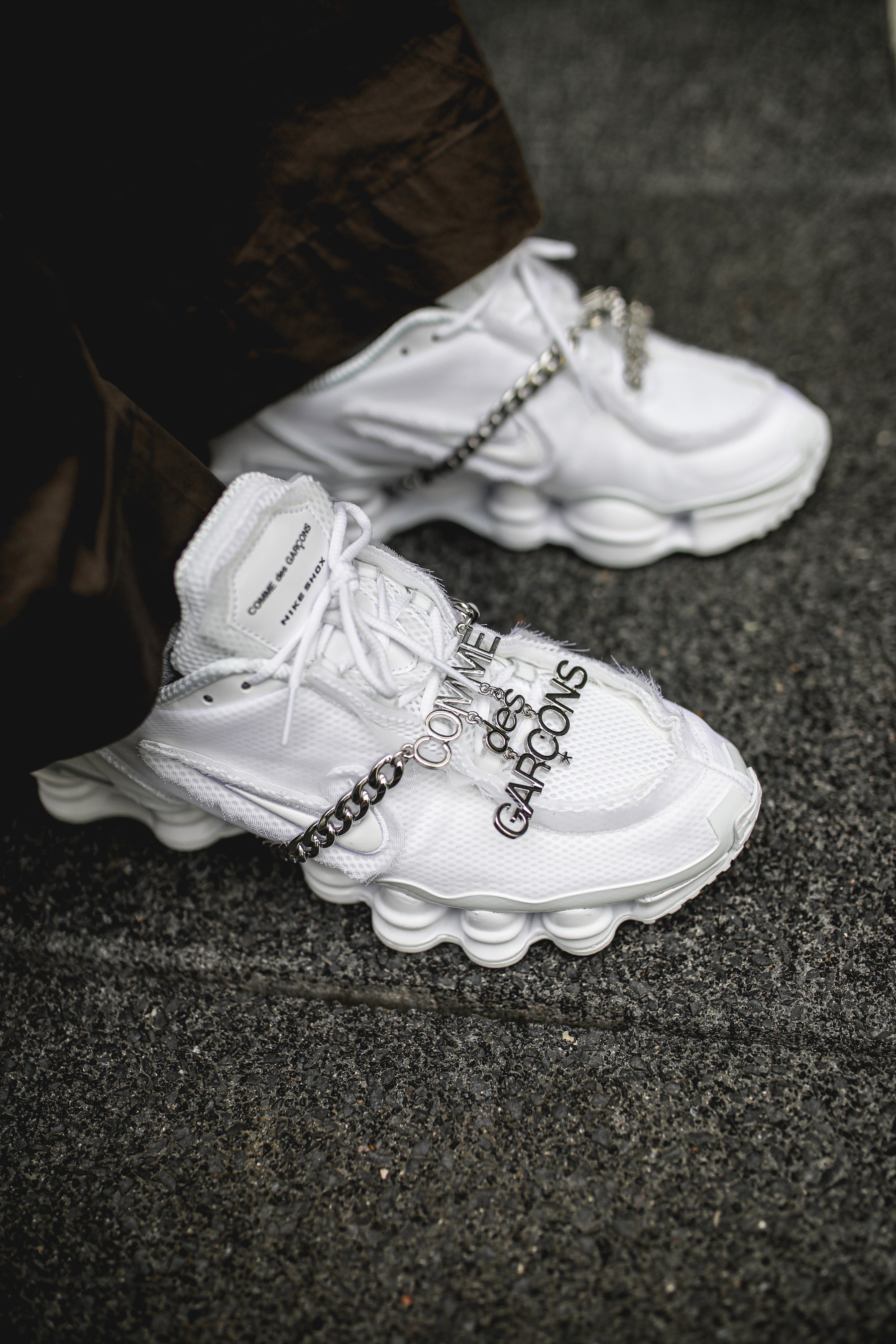 Au début de la semaine sortait en Francs et en Angleterre la Nike Shox TL x COMME des GARÇONS. Sold out en quelques minutes, nous vous la présentons quand même car un restock pourrait avoir lieu. Cette paire existant en noir ou blanc est parée d’un voile en nylon sur le dessus ainsi que d’une chaine COMME des GARÇONS en argent pour la blanche et en or pour la noir.